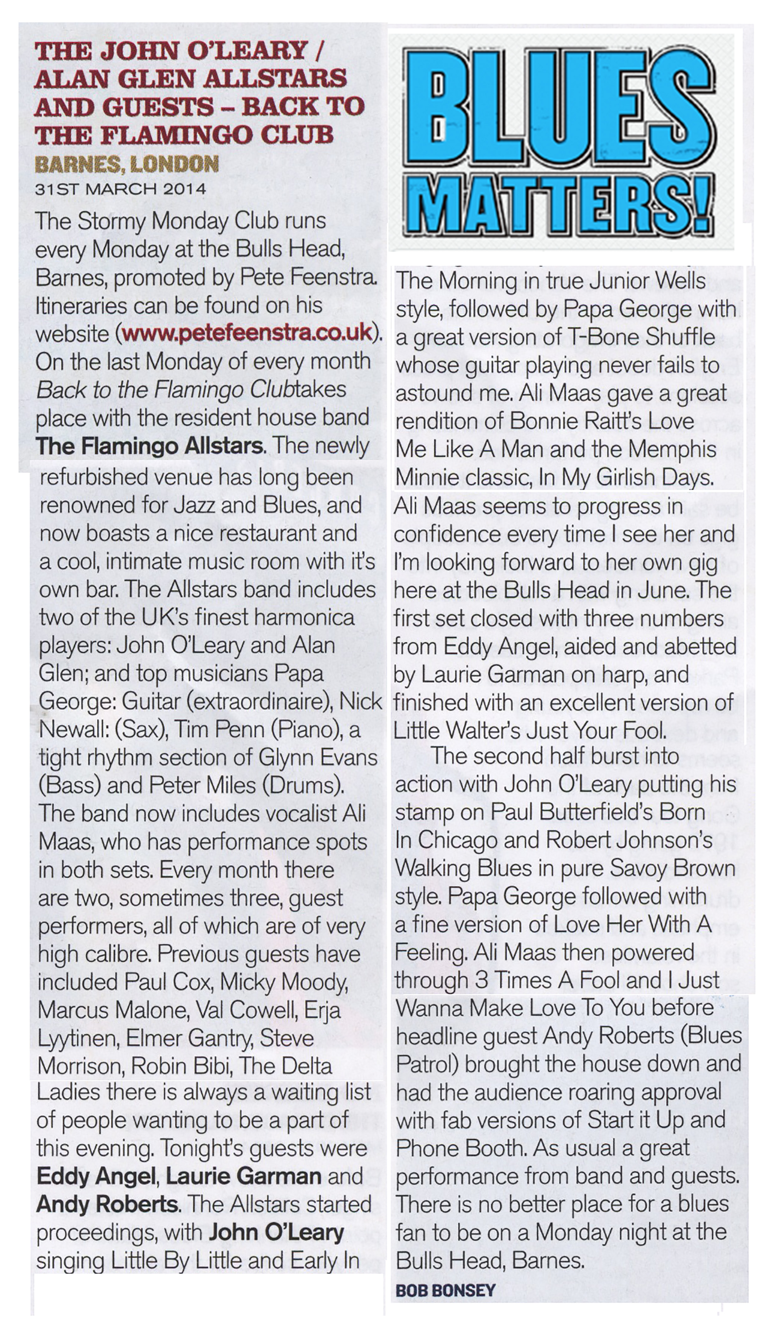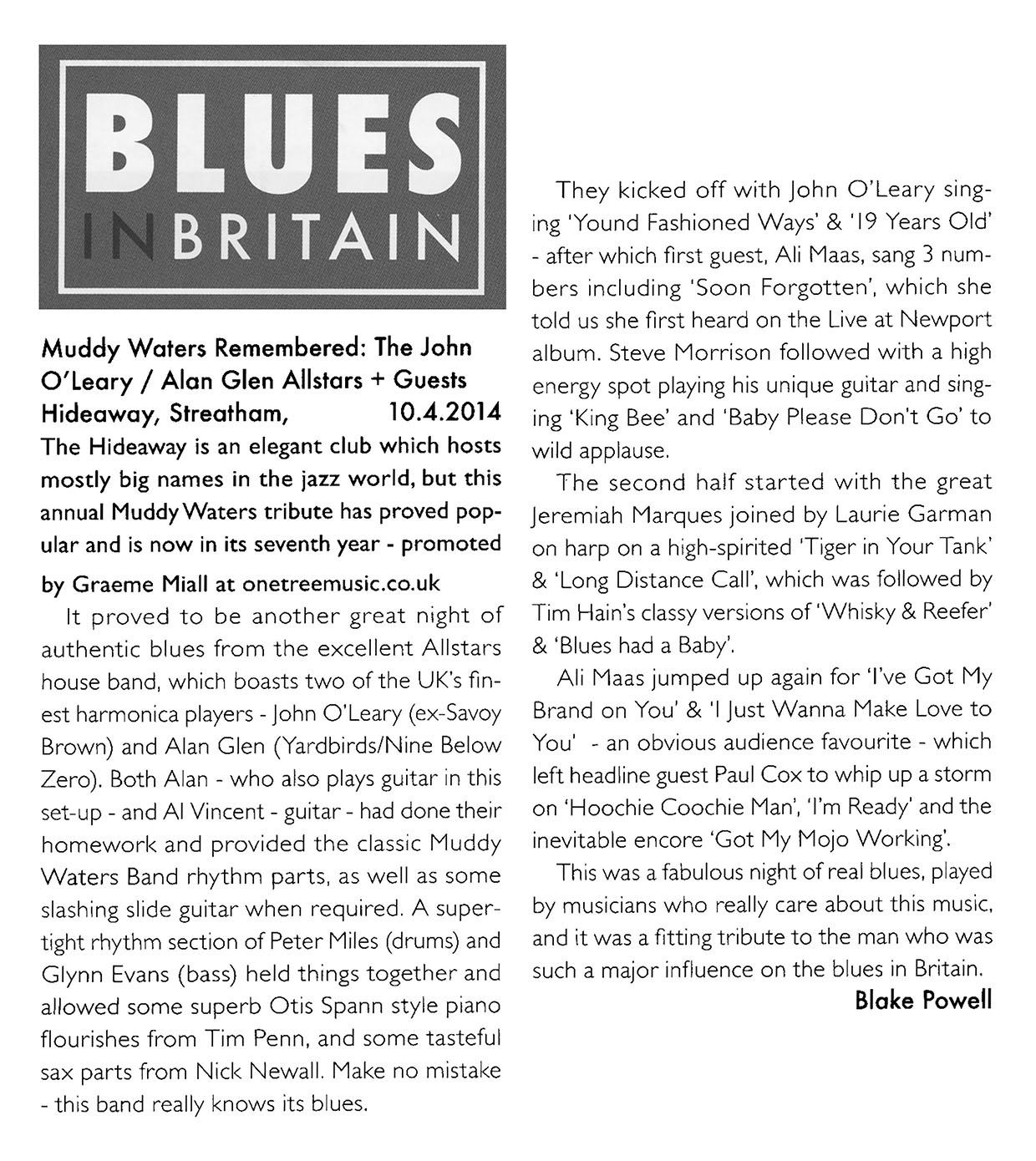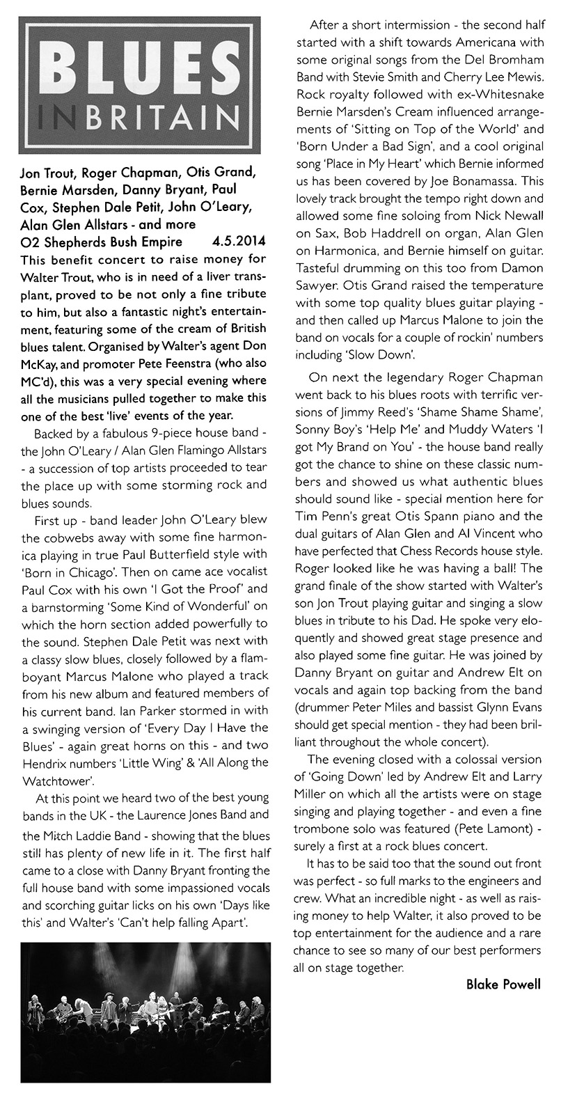 I look forward to the last guest Ali McKenzie of The Birds, the English Bird’s with Ron Wood and Kim Gardner, his voice is still intact. Perfect for R & B. McKenzie also swings as the best and with 'Hoochie Coochie Man' and " Rock Me Baby " to finish.