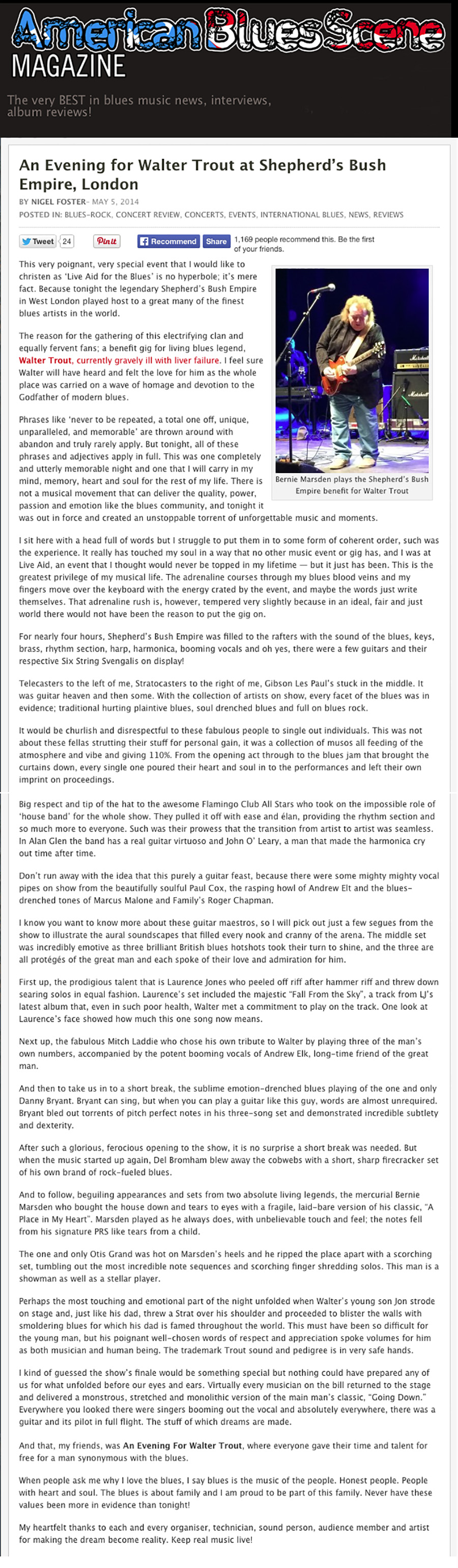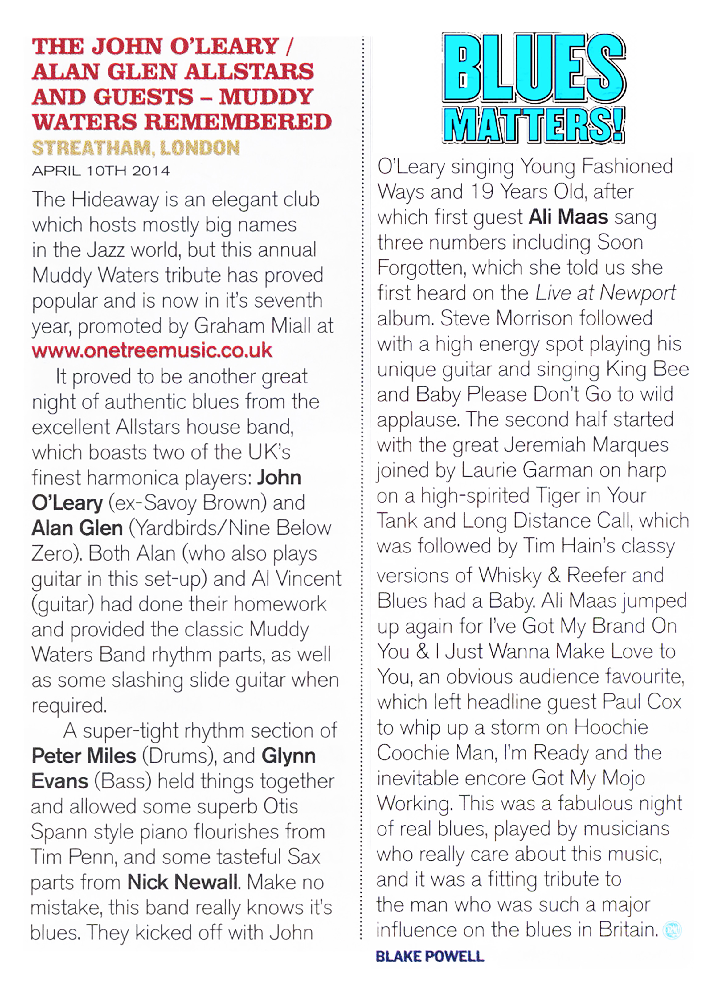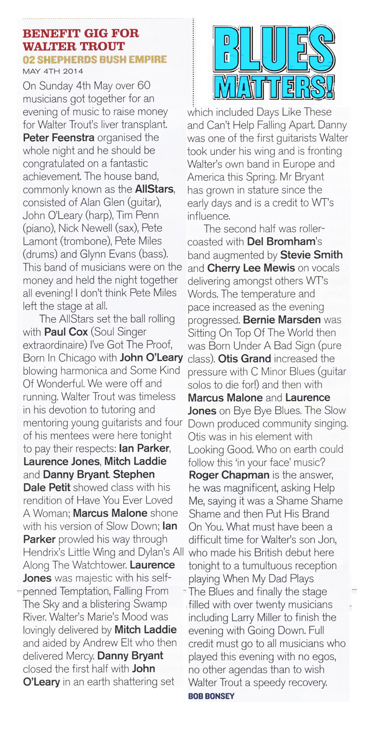 I look forward to the last guest Ali McKenzie of The Birds, the English Bird’s with Ron Wood and Kim Gardner, his voice is still intact. Perfect for R & B. McKenzie also swings as the best and with 'Hoochie Coochie Man' and " Rock Me Baby " to finish.
