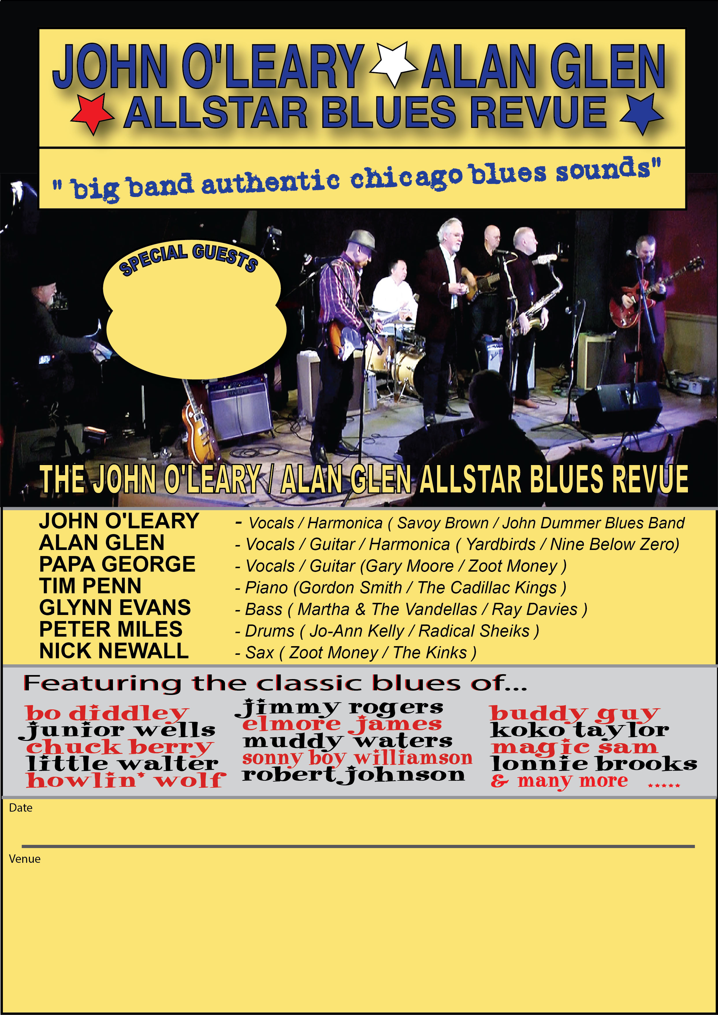 Alan Glen and John O'Leary form the spindle. Alan Glen (guitar, vocals, harmonica) you will know of Nine Below Zero and a reincarnation of The Yardbirds, John O'Leary (vocals and harmonica) his credits include Savoy Brown. The Guests of The All Stars may vary, but tonight features the creative Peter Miles on drums, the rock-solid Glynn Evans on bass, the sparkling Tim Penn on the keys and the improvising Nick Newall on sax. Guitarist Alan Vincent for me is a new member. Perhaps not a house - hold names, but all have a long track record of creating great music. Nick Newall played with Zoot Money and the Kinks, among others. Peter Miles drum credits include Jo-Ann Kelly, Rocket 88 and Jack Bruce.