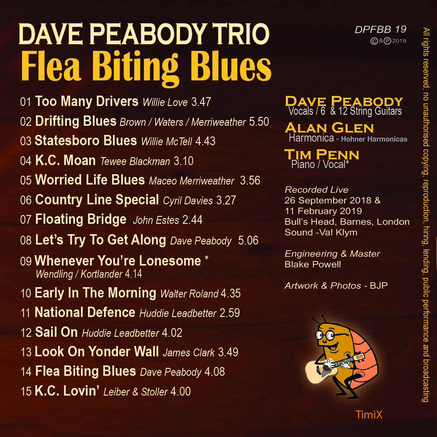 FLEA BITING BLUES Dave Peabody (vocals, guitar), Alan Glen (harmonica), Tim Penn (vocals, piano) * * * * * * The new CD “Flea Biting Blues” captures the trio performing live at the famous Bull’s Head jazz venue in Barnes, London. Recorded on two separate evenings the music reflects the trios collective love, understanding, and ability to play the kind of straight ahead, no frills, no nonsense blues that used to be performed by small acoustic ensembles back in the 30’s, ‘40’s and early ‘50’s, but which has now all but disappeared under the torrent of “Rock Blues” that dominates the current blues scene. Link to YouTube to watch videos of the Dave Peabody Trio performing various selections Enjoy Contact: Barcodes Music 020-7732-1127 or glenalan9@aol.com
